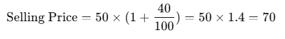 Следователно, продажната цена е70 доларакогато се приложи надценка от 40% към себестойност от 50 долара.