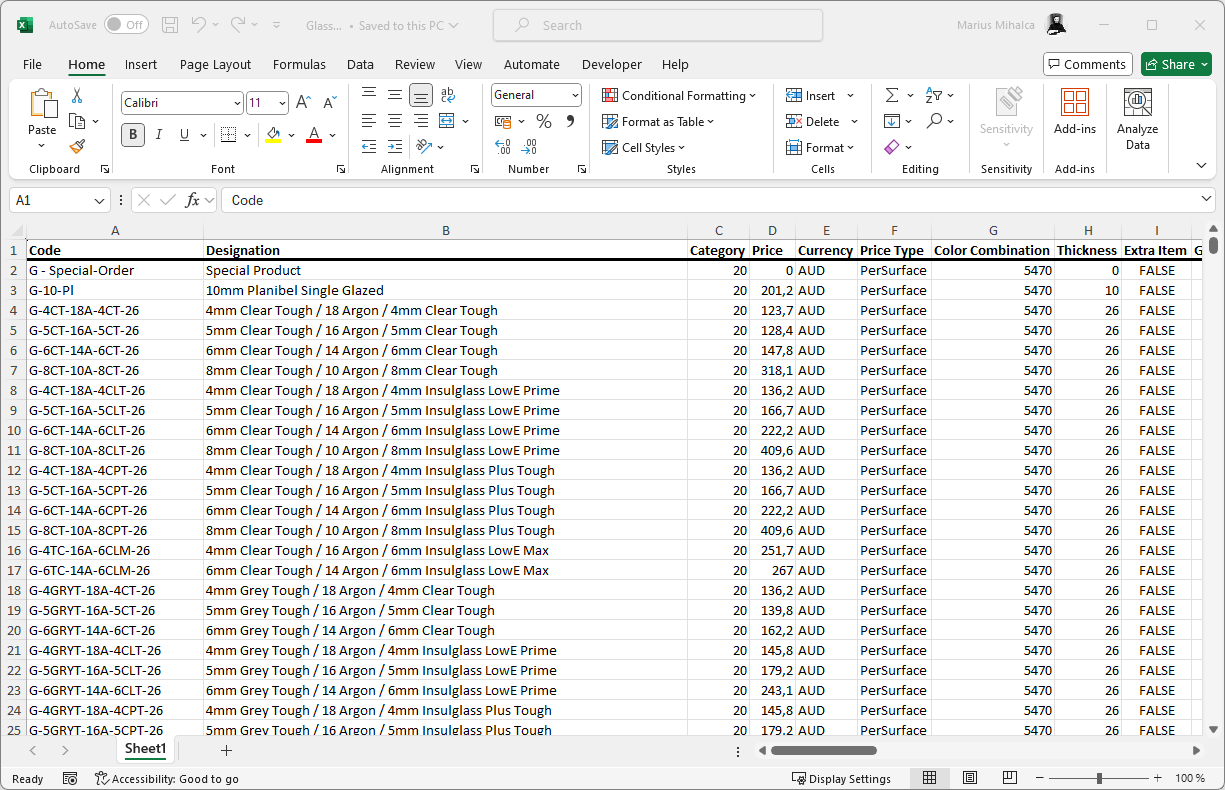 Друг често срещан сценарий включва импортиране на нови стъклени елементи в базата данни, без да се дефинират поотделно всеки един от тях.За да постигнете това, можете да дефинирате първоначален стъклен артикул, да го експортирате в Excel, да добавите новите артикули и след това да ги импортирате обратно в системата. Експортирането на съществуващ артикул служи като полезна справка за идентифициране на всички параметри, необходими за цялостно определение на аксесоара.