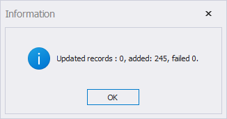 Щракнете върху OK, за да стартирате процеса на импортиране. След като приключите, ще бъдете подканени с резултатите, подробно описващи колко елемента са били актуализирани, колко нови елемента са били добавени и броя на елементите, при които са възникнали грешки. Важно е да се отбележи, че данните не се запазват автоматично в базата данни. Всички променени записи ще бъдат маркирани, което ви дава възможност да ги прегледате преди запазване. Ако резултатът е незадоволителен, можете да отмените операцията по импортиране и да започнете процеса отново.